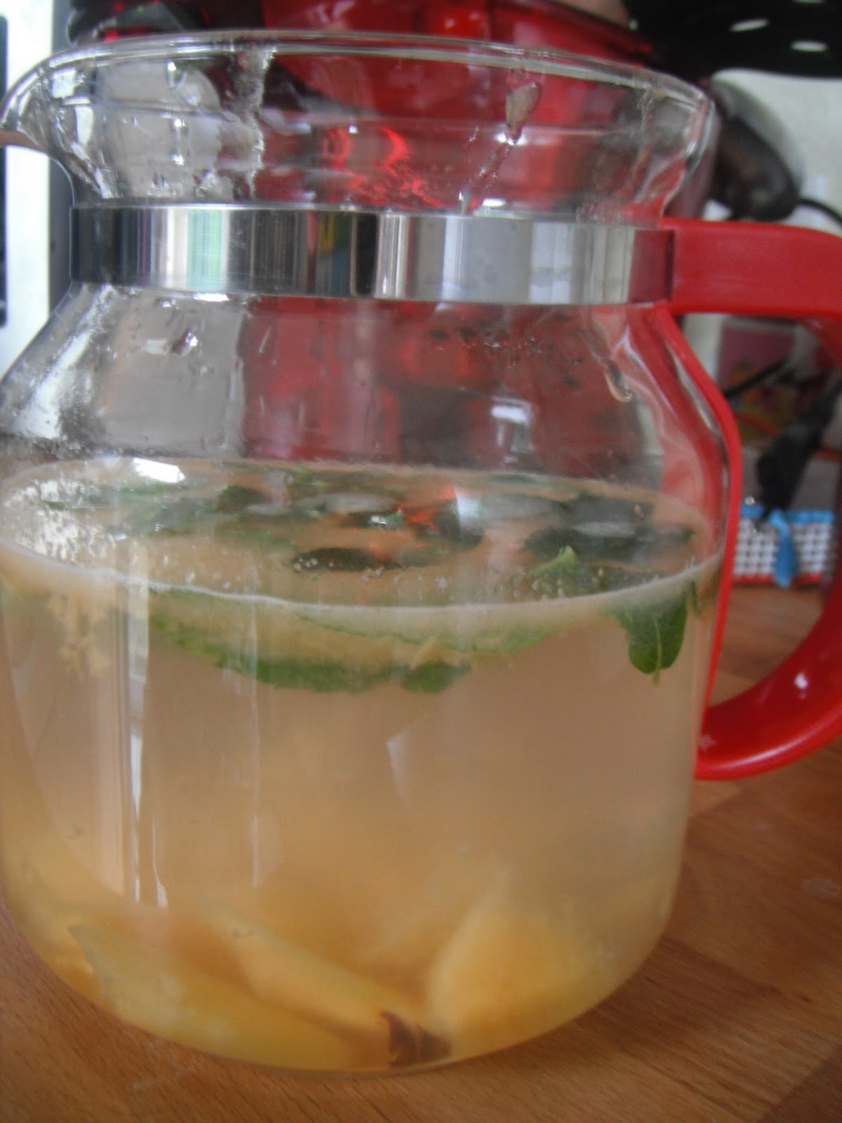 ... un brugnon jaune, un demi citron, quelques feuilles de menthe et environ 1 litre d'eau, et j'ai laissé macéré le tout toute la nuit.